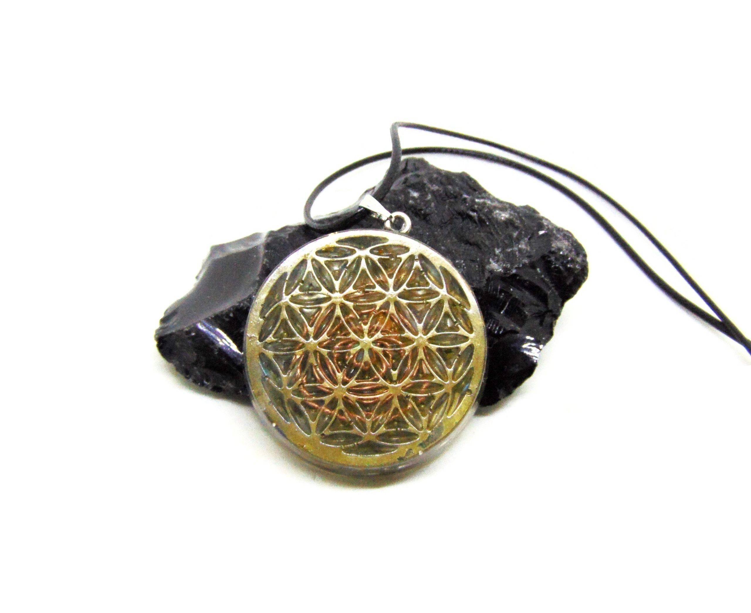 Pendentif composé d’un pendentif fait par inclusion *transparente en forme de fleur de vie, j’ai ajouté un lit de **labradorite avec un morceaux de cuivre en spirale.