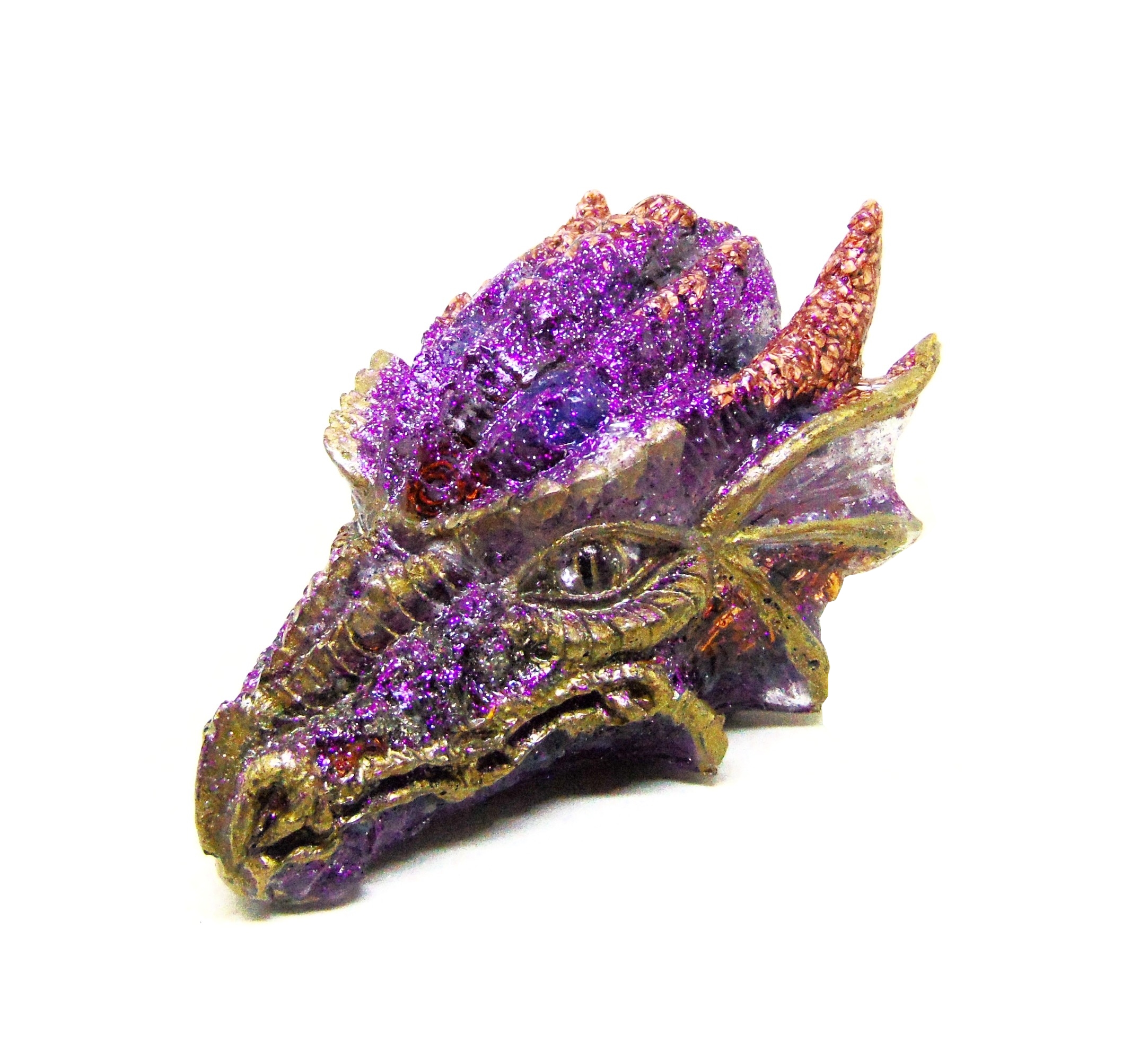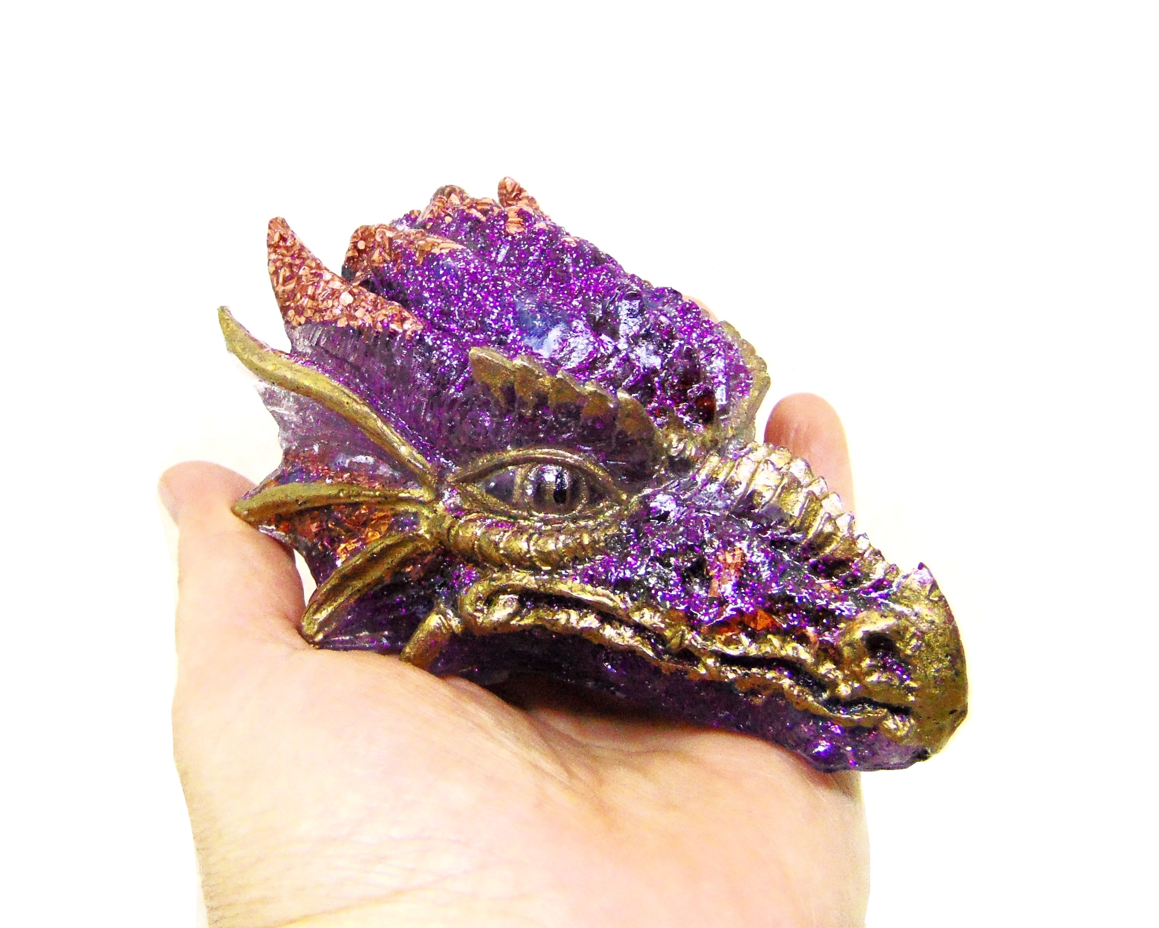J’ai ajouter des pyrite, sodalite et apatite avec des morceaux de feuilles d’***argent de d’or, 1 cristal de roche entouré de fil de cuivre   dans la *transparence et un léger pigment ****violet sur un lit d’aluminium, 1 fleur de vie et du cuivre avec de la poudre d’or en vague. J’ai peint certaines partie du corps du dragon à la penture d’**or.